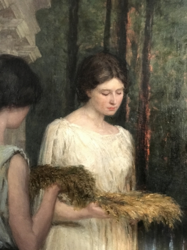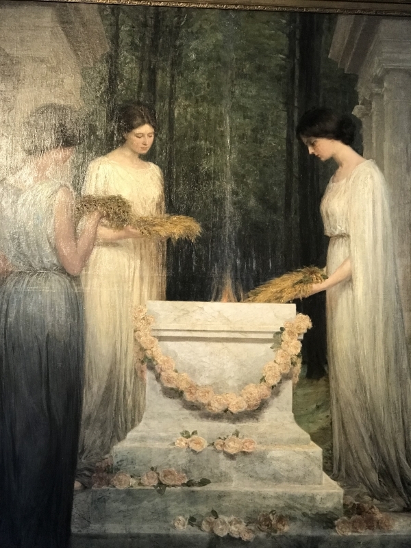 Na obrazie widzimy trzy piękne postacie kobiece w romantycznej scenerii greckiej świątyni. Wszystkie trzymają w dłoniach wianki zbożowe, gotowe położyć je na ołtarzu, na którym widnieje niewielki płomień. Artysta z niezwykłą precyzją odzwierciedlił kobiece postacie, których ujmujące piękno i wdzięk zapada w pamięć każdego, kto na nie spojrzy.