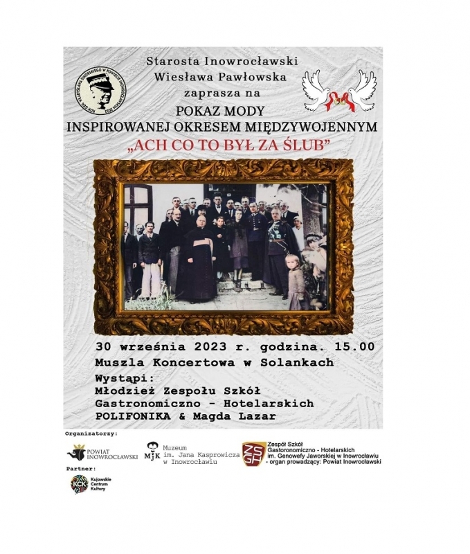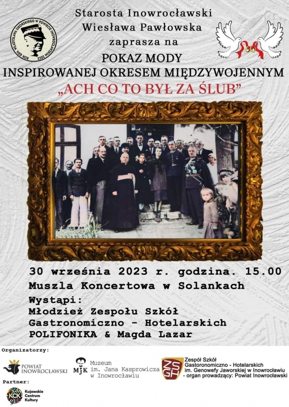 Zapraszamy w sobotę 30 września o 15:00 do Solanek, gdzie wspólnie z Zespołem Szkół Gastronomiczno - Hotelarskich w Inowrocławiu organizujemy wyjątkowe wydarzenie w ramach "Roku gen. Władysława Sikorskiego w Powiecie Inowrocławskim". Przed 87 laty, dokładnie 30 września córka gen. Władysława Sikorskiego Zosia została żoną por. Stanisława Leśniowskiego. Ślub odbył się w Parchaniu. Nawiązując do towarzyskiego wydarzenia z 1936 r. zapraszamy na pokaz mody inspirowanej okresem międzywojennym, któremu towarzyszyć będzie koncert Polifonika & Magda Lazar.