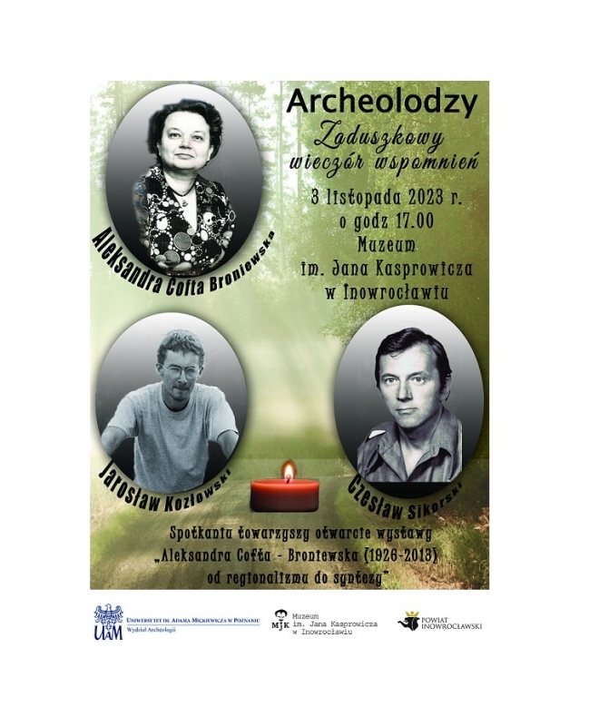 Początek listopada to czas kiedy myśli kierujemy ku nieobecnym. Naszym bliskim, przyjaciołom, nauczycielom... W piątkowy wieczór 3 listopada w Muzeum im. Jana Kasprowicza chcemy przypomnieć archeologów związanych z naszym Muzeum, związanych z tą ziemią, z Powiatem Inowrocławskim. Przywołamy postać prof. Aleksandry Cofty Broniewskiej (1926-2013), honorowego obywatela Inowrocławia, poznańskiej archeolożki kierującej Zespołem Badań Kujaw Uniwersytetu Adama Mickiewicza. Jej osiągnięcia to wykopaliska w Kruszwicy, Inowrocławiu, odkrycia w Kruszy Zamkowej a przede wszystkim grupa uczniów, nazywająca panią Profesor mianem „Mateczki”. Wspomnimy dr. Czesława Sikorskiego (1943-1995), archeologa z Muzeum im. Jana Kasprowicza i miejskiego konserwatora zabytków, wielkiego popularyzatora historii Inowrocławia. Jego „Miasto na soli” i „Encyklopedia wiedzy o zabytkach Inowrocławia” to chyba najważniejsze książki o mieście. Nie ma już wśród nas Jarosława Kozłowskiego (1974-2021), który swoją karierę naukową rozpoczynał w Muzeum im. Jana Kasprowicza. Jego opowieści o monetach i wykopaliskach brzmią jeszcze w salach muzeów w Inowrocławiu i Bydgoszczy. Serdecznie zapraszamy, ten zaduszkowy wieczór wspomnień dedykujmy naszym mistrzom, poprzednikom, przyjaciołom...