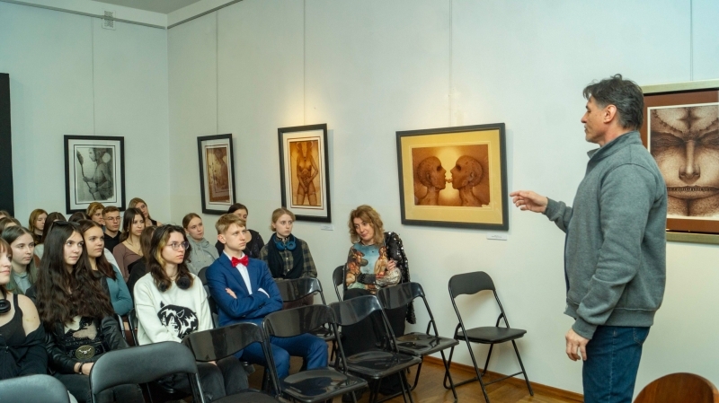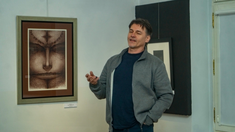 Andrzejem Tomaszewskim w otoczeniu jego dzieł, rysunków i obrazów.