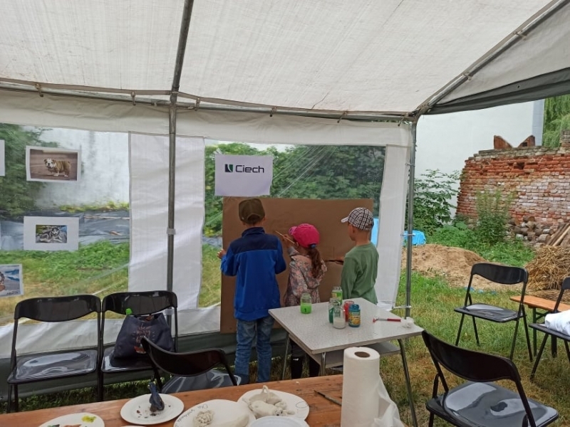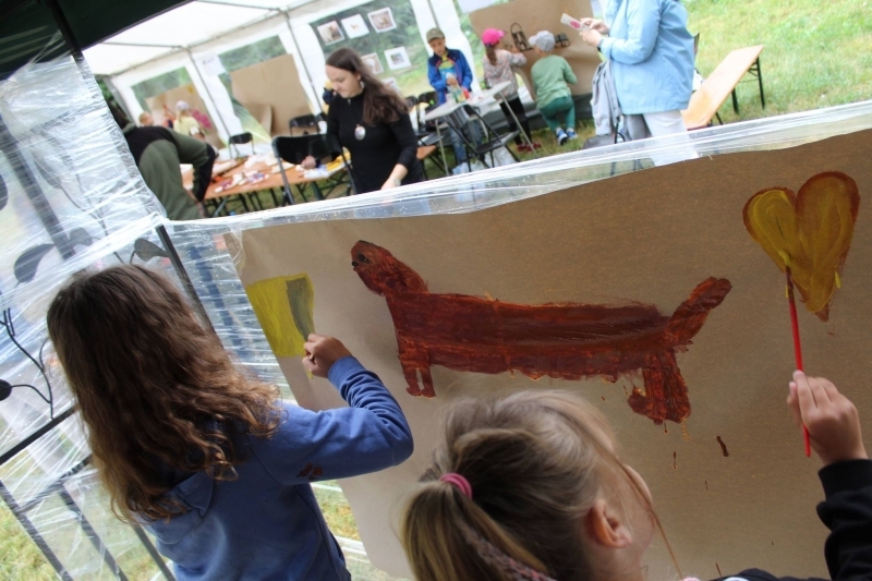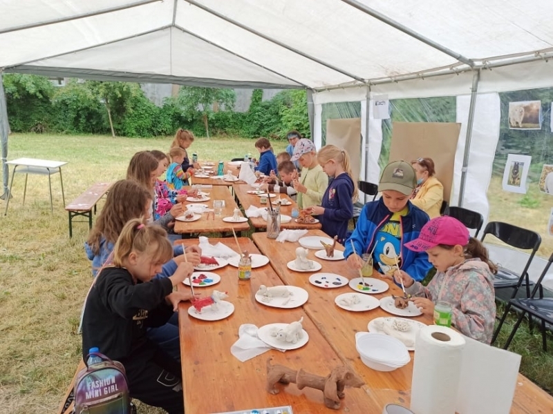 Spotkanie rozpoczęło się od zajęć plastycznych, podczas których dzieci pomalowały figurki piesków, które wykonały na poprzednich zajęciach. Na ścianach namiotu namalowane zostały także sporej wielkości malowidła przedstawiające psiaki.