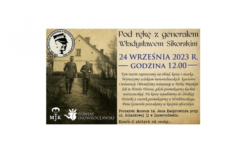 W niedzielę 24 września zapraszamy na kolejny spacer z gen. Władysławem Sikorskim, tym razem zapraszamy na obiad, kawę i ciastka... Wyruszymy szlakiem inowrocławskich kawiarni i restauracji. Odwiedzimy restaurację w Parku Miejskim i Hotelu Waissa, gdzie posmakujemy kuchni warszawskiej. Na kawę wpadniemy do Słodkiej Dziurki a ciastek spróbujemy u Wróblewskiego. Pana Generała znajdziemy pewnie w kasynie oficerskim przy brydżu i ...
