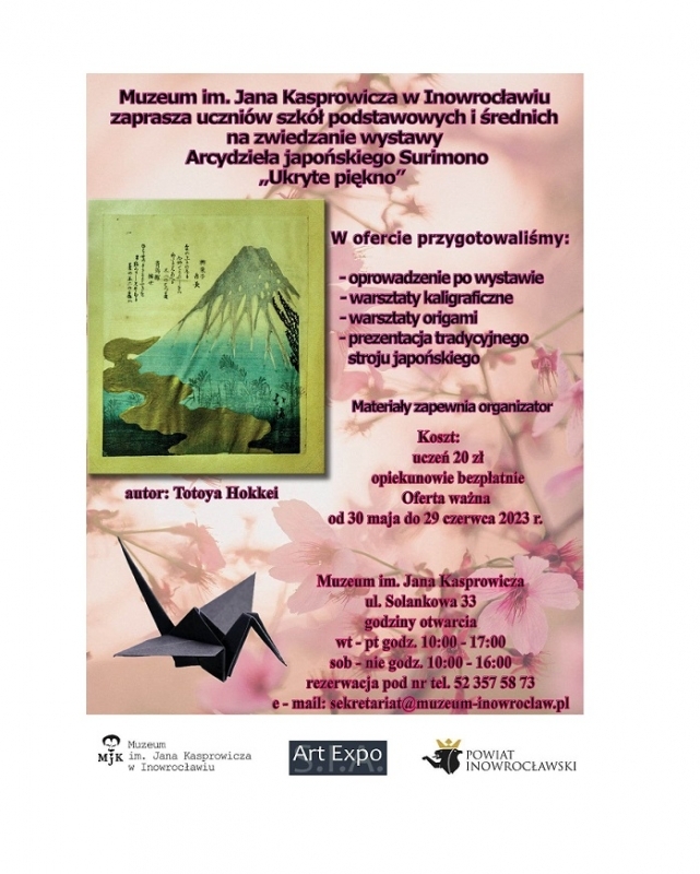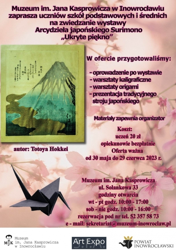 Do 29 czerwca w powiatowym Muzeum im. Jana Kasprowicza prezentowana będzie wystawa pt. Arcydzieła japońskiego Surimono ,,Ukryte piękno’’ (zorganizowana we współpracy z agencją ARTEXPO SIA). Wystawie towarzyszą warsztaty dla uczniów szkół podstawowych i średnich. Zajęcia obejmują zwiedzanie ekspozycji wraz z przewodnikiem oraz cześć warsztatową, podczas której uczestnicy spróbują swoich sił w kaligrafii, a także poznają tajniki sztuki origami. Dodatkową atrakcją będzie prezentacja tradycyjnego kimona japońskiego (dziękujemy Muzeum Okręgowe w Toruniu za pomoc).